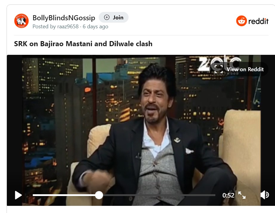 शाह रुख खान का ये वीडियो रेडिट पर वायरल हो रहा है, जो बॉली ब्लाइंड एन गॉसिप का है। वीडियो में किंग खान ने कहा कि फिल्मों का क्लैश बिल्कुल नहीं होना चाहिए, लेकिन एक साल में 200 फिल्में है और 54 हफ्ते तो किसी न किसी का क्लैश तो होगा ही। शाह रुख खान ने ये बात बाजीराव मस्तानी और दिवाले के क्लैश के दौरान कही थी।
