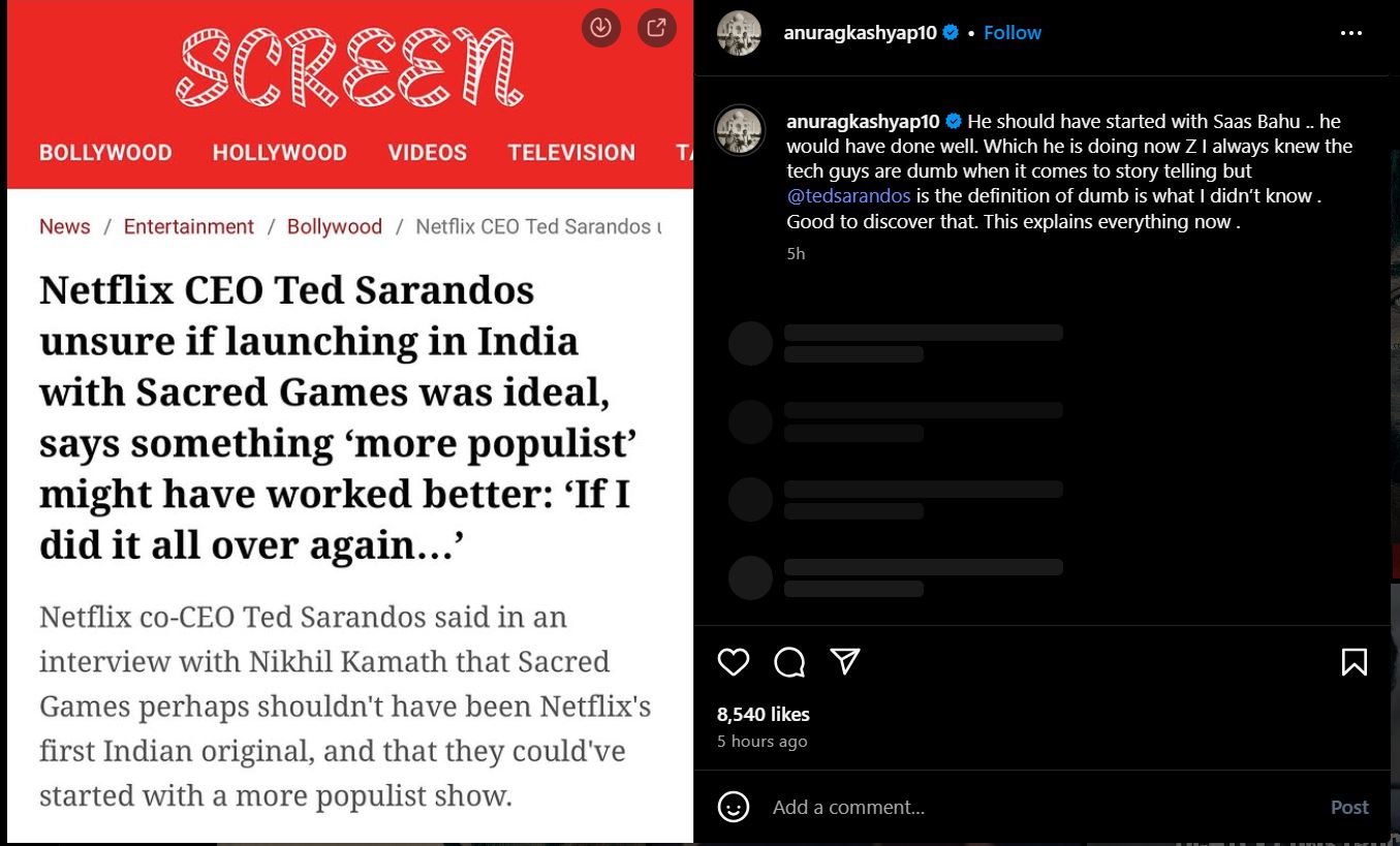 उन्होंने इंस्टाग्राम पर टेड को ‘बेवकूफ’ कहते हुए तंज कसा, “उन्हें सास-बहू शोज से शुरुआत करनी चाहिए थी, तब वे अच्छा करते। अब वे वही कर रहे हैं।” अनुराग का यह तंज एकता कपूर और नेटफ्लिक्स की हालिया डील की ओर था, जिसमें एकता के बालाजी टेलीफिल्म्स के साथ मिलकर कंटेंट बनाया जाएगा।