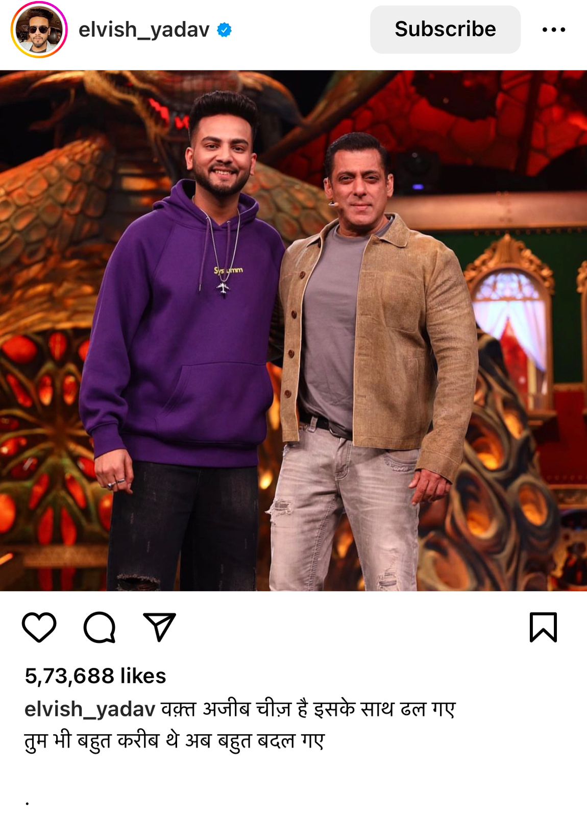 लेकिन इस फोटो से ज्यादा एल्विश यादव की ओर से दिया गया कैप्शन बन गया है। एल्विश ने लिखा है- ''वक्त अजीब चीज है इसके साथ ढल गए, तुम भी बहुत करीब थे अब अब बहुत बदल गए।'' इस तरह से बिग बॉस ओटीटी 2 विनर ने ये क्रिप्टिक कैप्शन लिखा है।