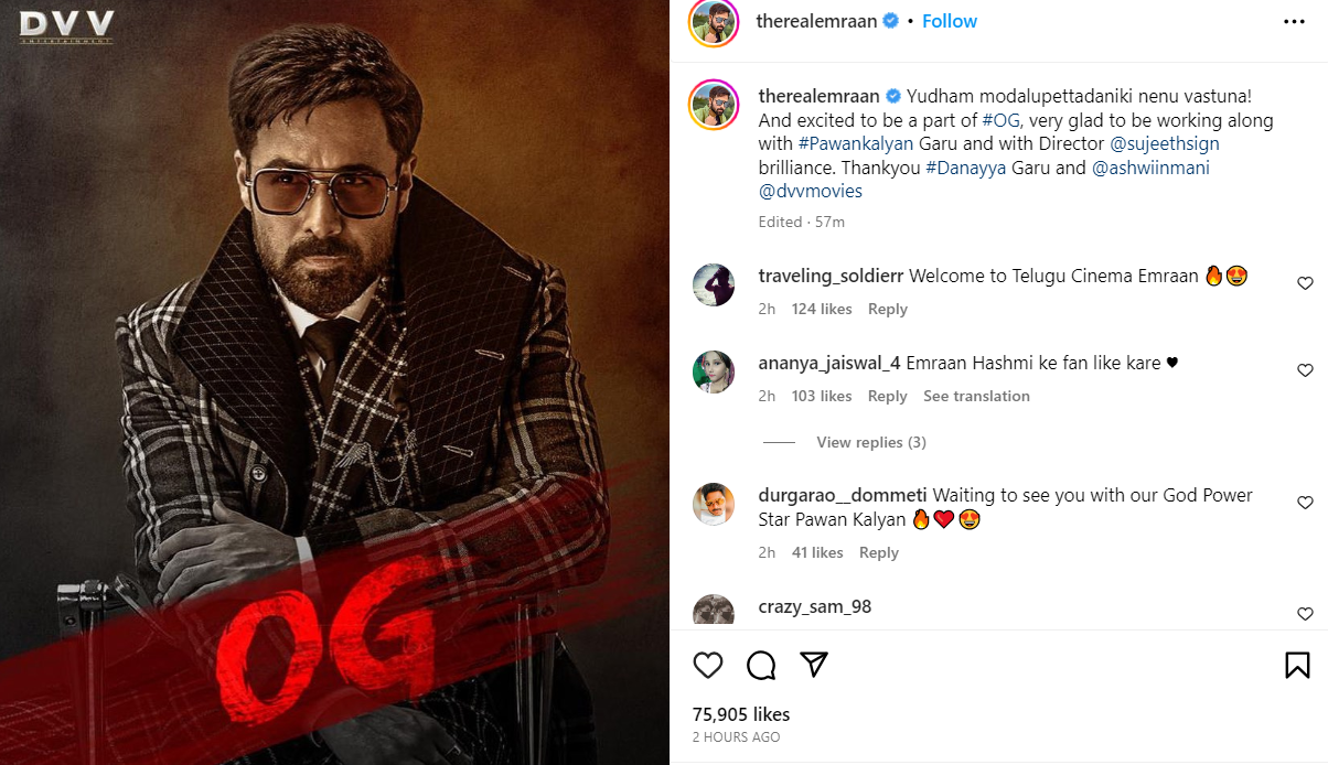 डायरेक्टर सुजीत ने जब से अपनी गैंगस्टर ड्रामा फिल्म 'ओजी' की घोषणा की है, तब से फिल्म दर्शकों के बीच चर्चा का विषय बनी हुई है। इस बहुप्रतीक्षित फिल्म 'ओजी' में पावर स्टार कल्याण लीड रोल में हैं। इसी बीच फिल्म को लेकर एक बड़ा अपडेट सामने आया है। कहा जा रहा है इस फिल्म में इमरान हाशमी भी लीड रोल अदा करते नजर आएंगे।