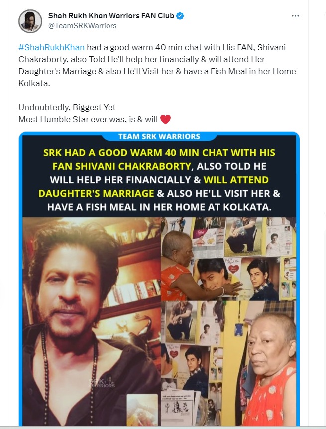 60 साल की कैंसर पीड़ित फैन पश्चिम बंगाल की रहने वालीं शिवानी चक्रवर्ती ने मरने से पहले शाह रुख खान से एक बार मिलने की इच्छा जताई थी। किंग खान ने भी अपनी फैन को बिल्कुल निराश नहीं किया और वह उनसे वीडियो कॉल के जरिये मिले। यहां पर पढ़ें पूरी खबर...