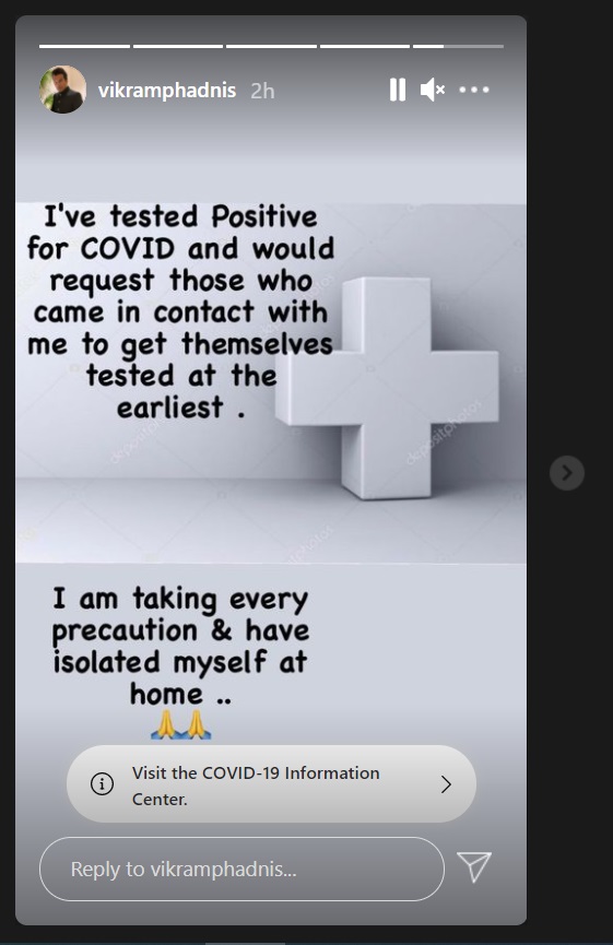 विक्रम ने अपने सोशल मीडिया अकाउंट इंस्टाग्राम पर एक पोस्ट शेयर ख़ुद इस बात की जानकारी दी है कि विक्रम का कोविड 19 का टेस्ट पॉजिटिव आया है जिसके बाद उन्होंने ख़ुद को आइसोलेट कर लिया है। विक्रम ने अपनी इंस्टाग्राम स्टोरी पर ये जानकारी देते हुए लिखा है, ‘मेरा कोविड 19 टेस्ट पॉजिटिव आया है, मैं रिक्वेस्ट करता हूं कि जो भी लोग पिछले कुछ दिनों में मेरे आसपास रहे हैं वो भी जल्द ही अपना कोविड टेस्ट करवा लें। फिलहाल मैंने ख़ुद को आइसोलेट कर लिया है और पूरी सावधानी बरत रहा हूं’।