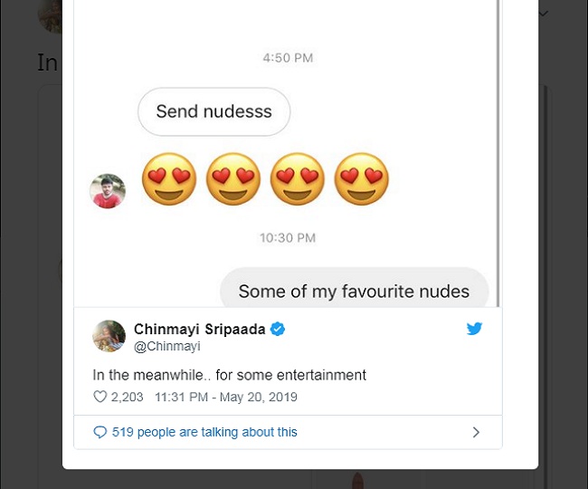 दरअसल, चिन्मयी ने अपने ट्विटर पर 20 मई को एक स्क्रिनशॉट शेयर किया जिसमें एक शख्स उनसे उनकी न्यूड तस्वीरों की डिमांड करता है। शख्स चिन्मयी को मैसेज करता है, 'सेंड न्यूड्स'। चिन्मयी ने भी फैन की इस डिमांड को नजरअंदाज नहीं किया बल्कि एक करारा जवाब दिया। इसके जवाब में चिन्मयी ने अपने सारी न्यूड शेड्स की लिपिस्टिक उससे सेंड कर दीं। चिन्मयी ने लिप्स्टिक के न्यूड शेड्स शेयर कर लिखा, 'ये मेरे कुछ पसंदीदा न्यूड्स हैं।' आपको बता दें कि लिपस्टिक के न्यूज शेड्स वो कलर होते हैं जो काफी हद तक स्किन टोन से मैच करते हैं और हल्के रंग के होते हैं।
