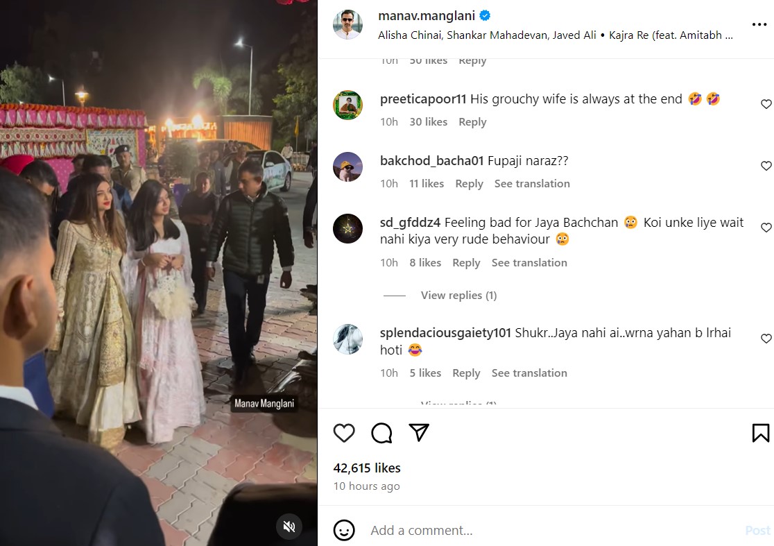 एक ने कमेंट किया, 'अच्छा है साथ में जया बच्चन नहीं आईं, वर्ना यहां भी लड़ाई होगी।' वहीं, एक अन्य ने लिखा, 'जया बच्चन के लिए बुरा लग रहा है क्योंकि उनके लिए वेट न करना रूड बिहेवियर है।'