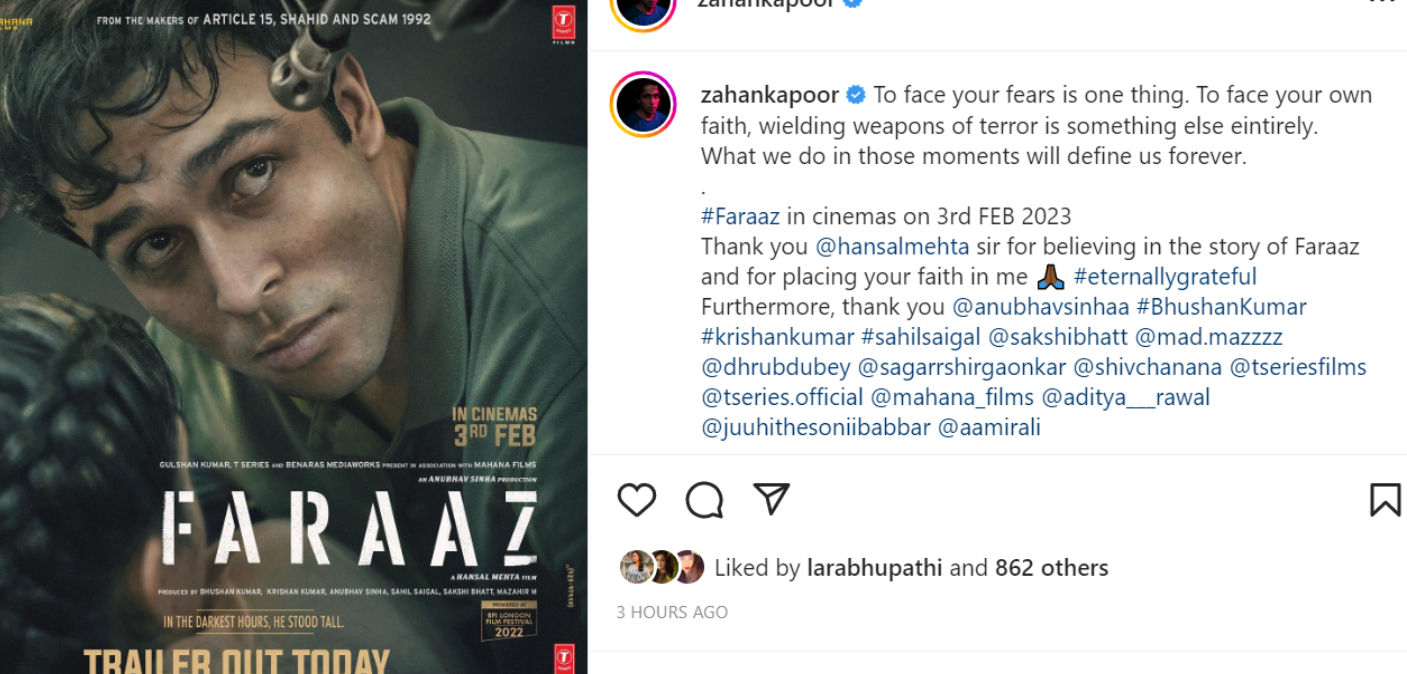 जहान ने सोमवार सुबह ट्रेलर आने की सूचना देते हुए सोशल मीडिया में एक थैंक्यू नोट भी शेयर किया था। अपने भय का सामना करना एक बात है। हथियारों के साये में अपने ही विश्वास का सामना करना, अलग बात है और उन लम्हों में हम जो करते हैं, वही हमें हमेशा के लिए बनाता है। जहान ने निर्देशक हंसल मेहता का शुक्रिया अदा करते हुए लिखा- फराज की कहानी में यकीन करने और मुझमें अपना भरोसा कायम रखने के लिए शुक्रिया सर।