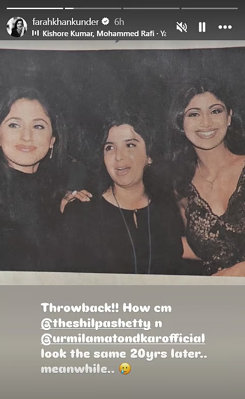 हालांकि फोटो पर फराह ने ऐसी कोई डिटेल शेयर नहीं की है कि ये फोटो कब और कहां ली गई है। कैप्शन में मजाकिया अंदाज में फराह ने लिखा,"थ्रोबैक!! शिल्पा शेट्टी और उर्मिला मातोंडकर 20 साल बाद भी वैसी ही कैसे दिखती हैं।" इस तस्वीर पर शिल्पा शेट्टी की नजर पड़ी, तो वह भी खुद को रिएक्ट करने से रोक नहीं पाईं। उन्होंने इस तस्वीर को अपनी इंस्टाग्राम स्टोरी पर री-पोस्ट कर फराह के लिए लिखा- 'तुम पागल हो'।