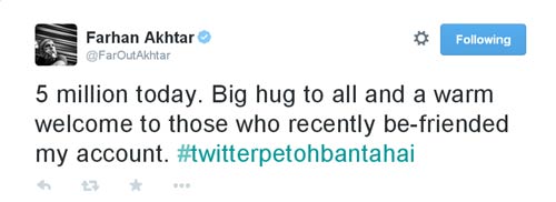 फॉलोअर्स की संख्या बढ़ने से खुश फरहान ने ट्विटर पर खुशी जाहिर की। उन्होंने ट्वीट किया, 'आज 5 मिलियन। जो लोग हाल ही में मेरे फॉलोअर्स बने हैं उनका स्वागत है।'