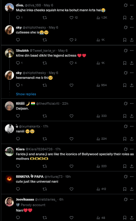 दूसरे यूजर ने लिखा, "फरीदा जी और अरुणा जी बॉलीवुड की आइकोनिक एक्ट्रेसेज हैं, उन्होंने जिस तरह से पर्दे पर मां के किरदार निभाए उनके बारे में क्या ही कहना"। एक और अन्य यूजर ने लिखा, "ये कितनी क्यूट हैं यार, इनको देखकर दिल को सुकून मिलता है"।