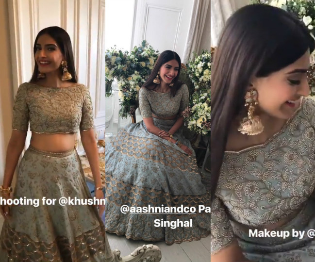 ग्रे-ब्लू और गोल्डन के कॉम्बिनेशन का यह लहंगा सोनम कपूर पर खूब जंच रहा है, है ना? गोल्डन-नेट बॉर्डर और बोट-नैक का टॉप बड़े गोल्डन एअरिंग्स, स्ट्रेट हेयर्स और रेड लिपस्टिक...Wow!