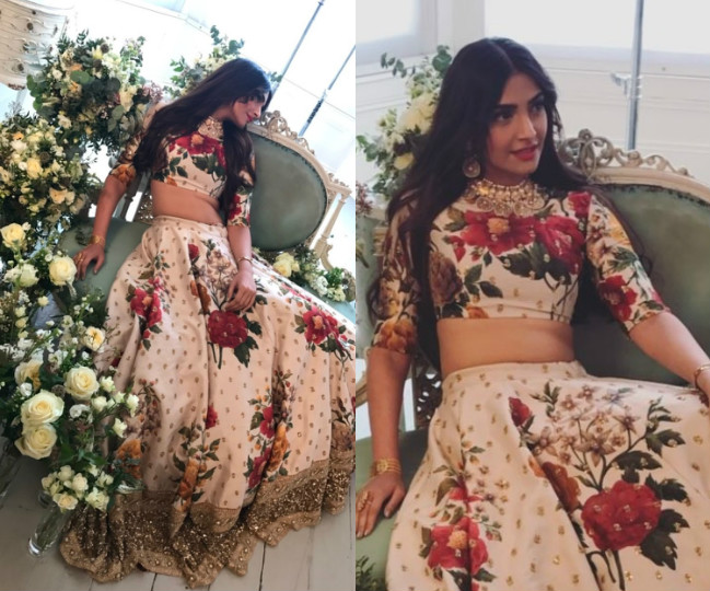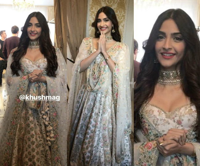 सोनम का एक और इंडियन ऑउटफिट, डीप नैक ब्लाउज, फ्लावरी लहंगा, फ्लावर बॉर्डर के साथ नेट दुपट्टा, बिग-शायनी चोकर नैकपिस, परफेक्ट मेकअप और वेवी हेयर्स, सोनम वाकई बहुत प्यारी लग रही है।