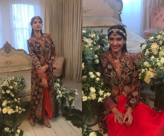 सोनम का यह लुक हमें वैसे कुछ ख़ास अच्छा नहीं लगा मगर जिस तरीके से उन्होंने इसे कैरी किया है वो काफ़ी अच्छा था। रेड धोती स्टाइल लहंगा, लॉन्ग हाई-नैक का टॉप और बालों में मांगटिका और एम्ब्रोइड पट्टा, इस लुक में बालाओं के साथ की एक्सपेरिमेंट ज़रूर करना चाहिए था। आपको क्या लगता है?