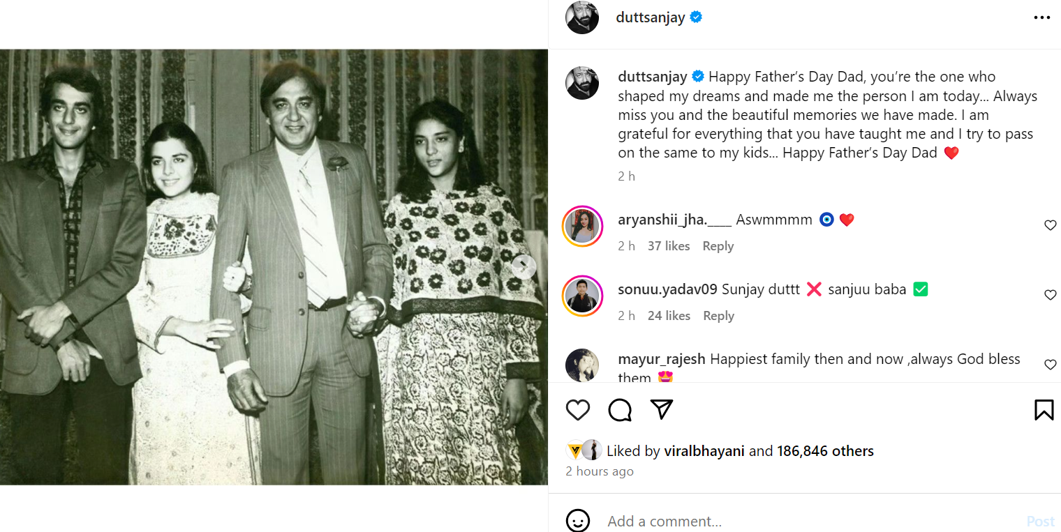 अभिनेता ने अपने सोशल मीडिया हैंडल इंस्टाग्राम पर एक पोस्ट शेयर किया। इसमें उन्होंने सुनील दत्त के साथ एक ब्लैक एंड व्हाइट तस्वीर शेयर की और कैप्शन में लिखा कि हैप्पी फादर्स डे डैड, आप ही हैं, जिन्होंने मेरे सपनों को आकार दिया और मुझे वह व्यक्ति बनाया जो मैं आज हूं।