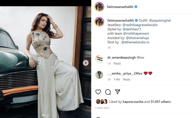 फातिमा सना शेख फिल्म एक्ट्रेस है। उन्होंने कई फिल्मों में काम किया है। वह वेब सीरीज में भी नजर आ चुकी है। वह अक्सर अपनी हॉट और बोल्ड तस्वीरें और वीडियो सोशल मीडिया पर शेयर करती है। वह जल्द फिल्म सैम बहादुर में भी नजर आएंगी। इस फिल्म में उनके अलावा विक्की कौशल की अहम भूमिका होगी। फातिमा सना शेख ने हाल ही में अपनी और भी कई तस्वीरें शेयर की थी, जिसमें उन्हें व्हाइट कलर का स्लीवलैस क्रॉप टॉप पहनकर बोल्ड पोज देते हुए देखा जा सकता है। उनकी तस्वीरें सोशल मीडिया पर वायरल हो गई थी। कई लोगों ने तस्वीरों पर अमेजिंग कमेंट भी किया था।