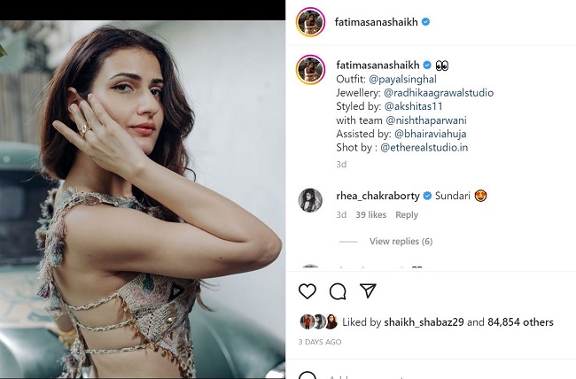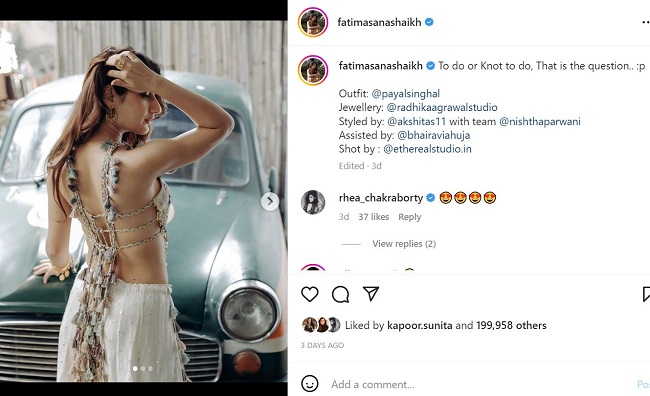 तस्वीरें शेयर करते हुए फातिमा सना शेख ने लिखा है, 'यह करना चाहिए या नहीं करना चाहिए, यही प्रश्न है।' इसके अलावा तस्वीरों में उनके टॉप में लगे क्नॉट भी लोगों का ध्यान आकर्षित किया है। इस फोटो पर कई लोगों ने कमेंट किया है। आमिर खान की बेटी आइरा खान ने भी पॉपिंग दिल की इमोजी शेयर की है। फातिमा सना शेख की तस्वीरों को देखकर कई फैंस शादी के कयास लगा रहे हैं। फातिमा को लेकर खबरें हैं कि वह जल्द शादी कर सकती है। हालांकि उन्होंने अभी तक अपने दोस्तों को लेकर कोई चर्चा नहीं की है।