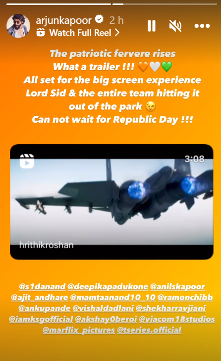 वहीं, अर्जुन कपूर 'फाइटर' के ट्रेलर से काफी प्रभावित हुए और उन्होंने निर्देशक सिद्धार्थ आनंद के साथ-साथ फिल्म की पूरी टीम की भी सराहना की। अर्जुन ने लिखा 'देशभक्ति का उत्साह बढ़ता है, क्या ट्रेलर है। बड़े पर्दे के अनुभव के लिए पूरी तरह तैयार, लॉर्ड सिड और पूरी टीम पार्क के बाहर इसका आनंद ले रही है। गणतंत्र दिवस का इंतजार नहीं कर सकते'।
