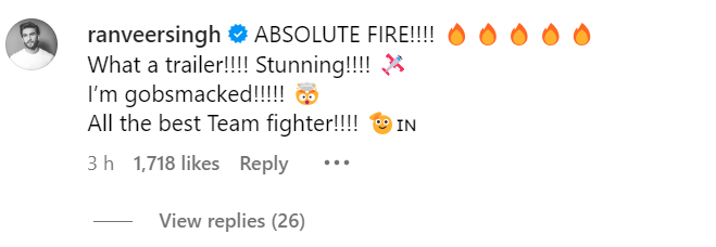 जैसे ही निर्माताओं ने फिल्म के ट्रेलर को जारी किया, उसके बाद रणवीर सिंह ने कमेंट कर इस पर अपनी प्रतिक्रिया दी। रणवीर ने लिखा 'बिल्कुल आग। क्या ट्रेलर है, अद्भुत। मैं चकित हो गया हूं। सर्वश्रेष्ठ, सर्वश्रेष्ठ टीम फाइटर'।