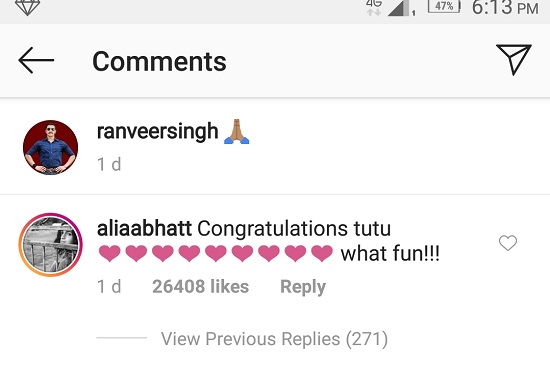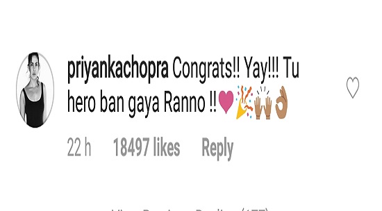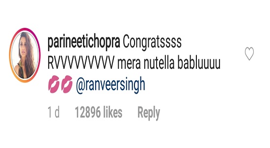 फिल्म अभिनेत्री परिणीति चोपड़ा ने रणवीर सिंह को बधाई देते हुए अंग्रेजी अक्षर RV का उपयोग करते हुए आगे लिखा है मेरा ‘न्यूटेला’ बबलूl