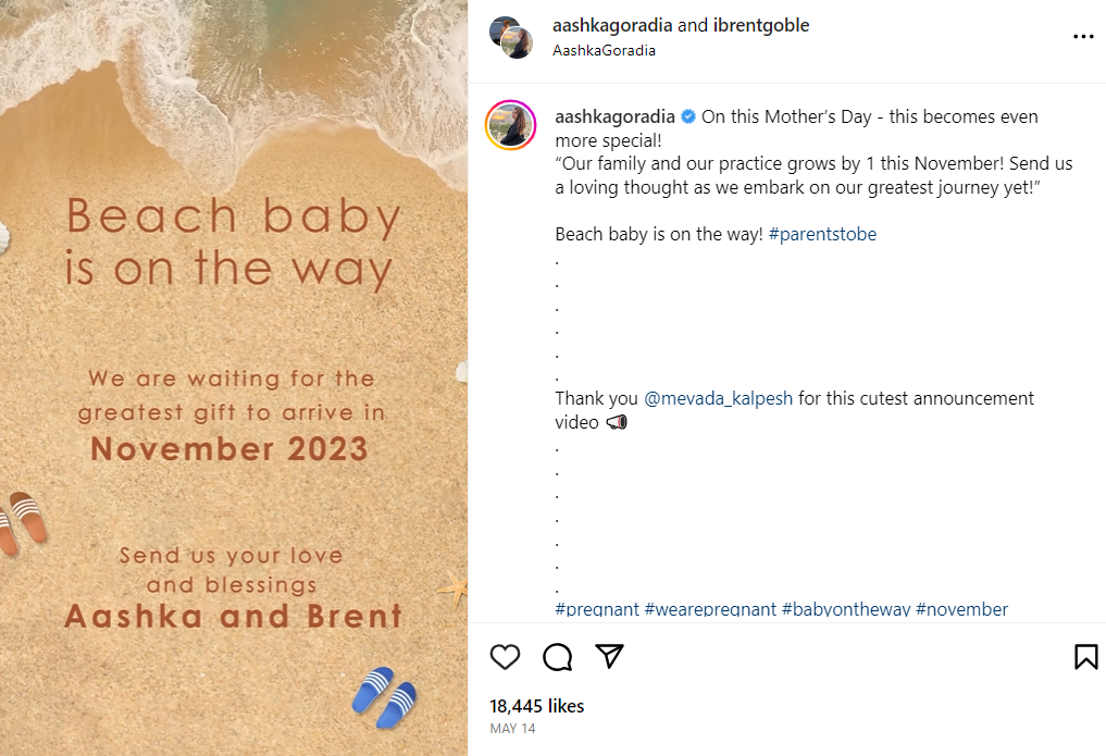बीते दिनों आशका ने प्रेग्नेंसी के साथ-साथ बेबी के डिलीवरी मंथ भी साझा किया था। एक्ट्रेस ने प्रेग्नेंसी का वीडियो शेयर कर कैप्शन लिखा था- 'इस मदर्स डे पर - यह और भी खास हो जाता है! इस नवंबर हमारा परिवार और हमारा अभ्यास बढ़ जाएगा।