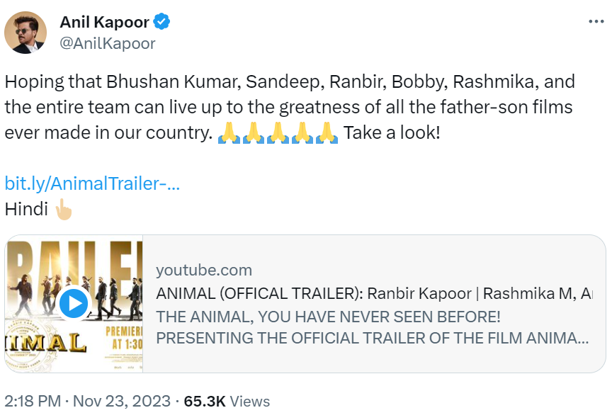 'एनिमल' से पहले कई फिल्मों की कहानी में बाप-बेटे के रिश्ते को पिरोया गया है। कहीं दोनों में टकराव, तो कहीं बॉन्डिंग दिखायी गयी है। अनिल कपूर के ट्वीट से अंदाजा लगता है कि बाप-बेटे पर बनी शानदार फिल्मों के बीच वो इसे देखना चाहते हैं-