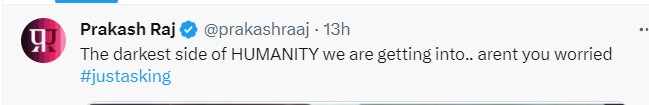 एक्टर और पॉलिटिशियन प्रकाश राज ने मुजफ्फरनगर की घटना को मानवता का काला सच बताया है। उन्होंने लिखा, ''हम मानवता के सबसे डार्क साइड में प्रवेश कर रहे हैं...क्या आपको चिंता नहीं है।''