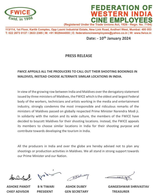 बीते बुधवार को FWICE ने मालदीव के मंत्रियों द्वारा प्रधानमंत्री नरेंद्र मोदी पर की गई टिप्पणियों की कड़ी निंदा करते हुए एक प्रेस रिलीज जारी की और सभी फिल्म प्रोड्यूसर से मालदीव में अपनी शूटिंग रद्द करने की अपील की। प्रेस रिलीज जारी करते हुए उसमें लिखा गया कि 'देश और इसकी व्यापक संस्कृति के साथ एकजुटता दिखाते हुए, FWICE के सदस्यों ने अपने शूटिंग स्थानों के लिए मालदीव का बहिष्कार करने का फैसला किया है।