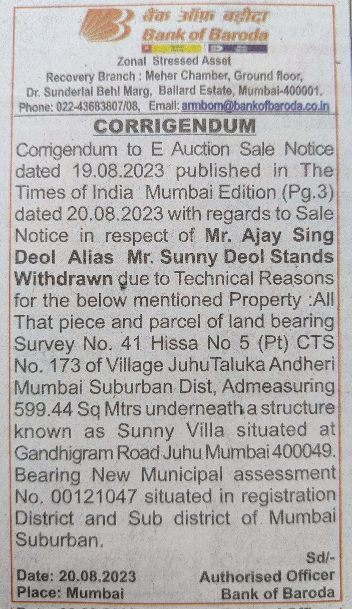 वहीं, अब इस खबर को लेकर नई अपडेट सामने आई है। बैंक ऑफ बड़ौदा ने 21 अगस्त को एक नई नोटिस जारी की है, जिसके अनुसार, सनी देओल के बंगले के ई-ऑक्शन का नोटिस वापस ले लिया है। बैंक ने इसके पीछे की वजह टेक्निकल कारण बताए है।