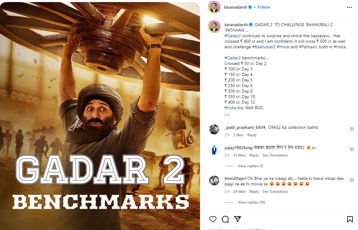 गदर 2 पहले ही आमिर खान की दंगल और रणबीर कपूर की संजू जैसी ब्लॉकबस्टर फिल्मों को पछाड़ चुकी है। अब फिल्म 500 करोड़ क्लब की ओर बढ़ने का सफर शुरु कर चुकी है। गदर 2 जितने धड़ल्ले से बिजनेस करती जा रही है उसे देखकर ऐसा लग रहा है कि फिल्म जल्द 500 करोड़ का आंकड़ा भी पार कर जाएगी और एक नया अध्याय लिखेगी।