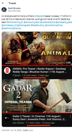 सोशल मीडिया पर भी रणबीर कपूर की एनिमल और गदर 2 के टकराव की काफी चर्चा है। एक फैन ने सनी देओल के 'गदर 2' के टीजर और रणबीर कपूर की 'एनिमल' के टीजर को यूट्यूब पर मिले व्यूज का स्क्रीनशॉट शेयर करते हुए लिखा, "गदर 2 और पूरी टीम को लोगों का बहुत प्यार मिल रहा है।