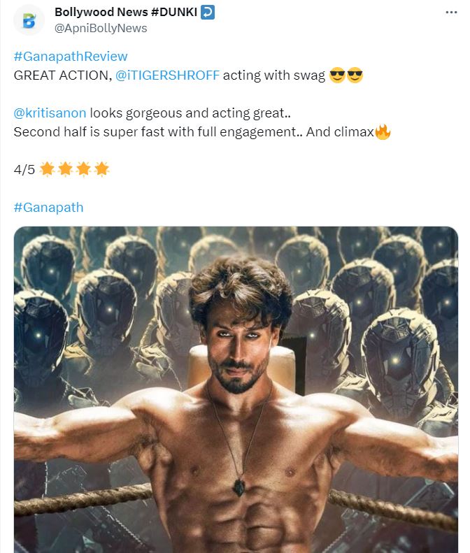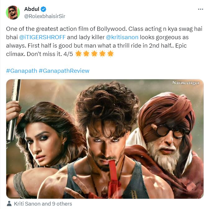 Ganapath Twitter Review टाइगर श्रॉफ और कृति सेनन की जोड़ी फ्यूचरिस्टिक साई-फाई फिल्म गणपत के साथ फिल्मी पर्दे पर लौट चुकी है। इस फिल्म के साथ दोनों की जोड़ी आठ साल बाद नजर आई। गणपत से टाइगर-कृति अपने फैंस का दिल जीतने में सफल रहे या असफल जाने ट्विटर रिव्यू।