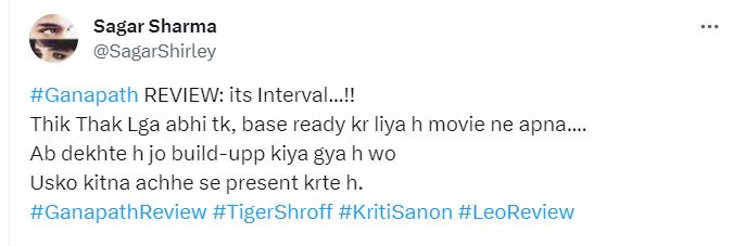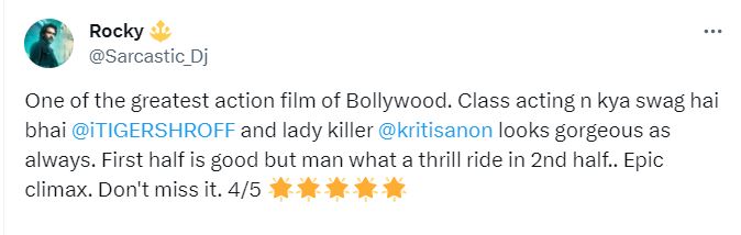 एक और यूजर ने फिल्म पर अपनी राय देते हुए कहा, "टाइगर श्रॉफ का एक्शन और स्वैग है। कृति सेनन बहुत ही खूबसूरत लग रही हैं और उनकी एक्टिंग भी काफी अच्छी है। फिल्म का सेकंड हाफ काफी इंगेजिंग है"।