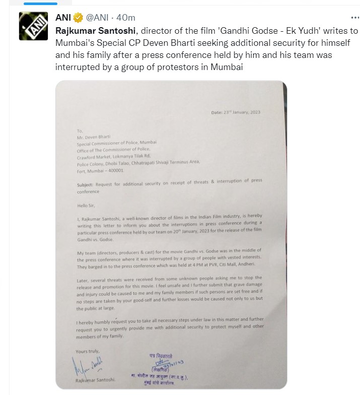 लेटर में राजकुमार संतोषी ने लिखा कि 20 जनवरी को अंधेरी में फिल्म 'गांधी गोडसे एक युद्ध' की स्क्रीनिंग रखी गई थी। उनकी टीम (डायरेक्टर, प्रोड्यूसर और फिल्म की कास्ट) प्रेस कॉन्फ्रेंस कर रही थी कि कुछ लोगों ने हंगामा किया। बाद में कुछ अज्ञात लोगों से धमकी मिली कि फिल्म की रिलीज और प्रमोशन को रोक दिया जाए। उन्होंने लिखा कि उन्हें सेफ फील नहीं हो रहा औ अगर इन लोगों को यू्ं ही छोड़ दिया गया तो उन्हें व उनके परिवार को किसी भी तरह का नुकसान पहुंचाया जा सकता है।