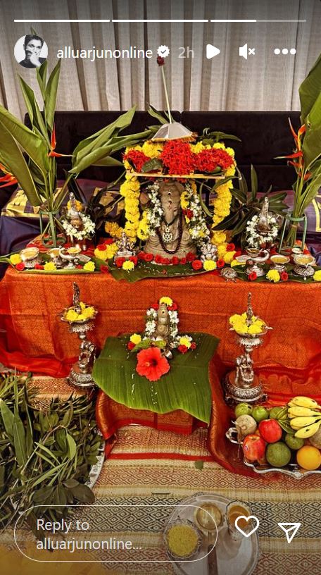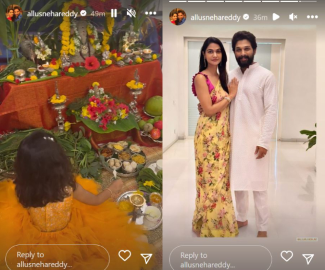 बॉलीवुड सितारों के साथ-साथ साउथ स्टार्स भी धूमधाम से 'गणेश चतुर्थी' सेलिब्रेट कर रहे हैं। साउथ सुपरस्टार अल्लू अर्जुन ने अपने घर में 'गणपति बप्पा' का स्वागत कर लिया है, जिसकी कुछ खूबसूरत फोटोज उनकी पत्नी स्नेहा ने अपने इंस्टाग्राम पर शेयर की हैं।