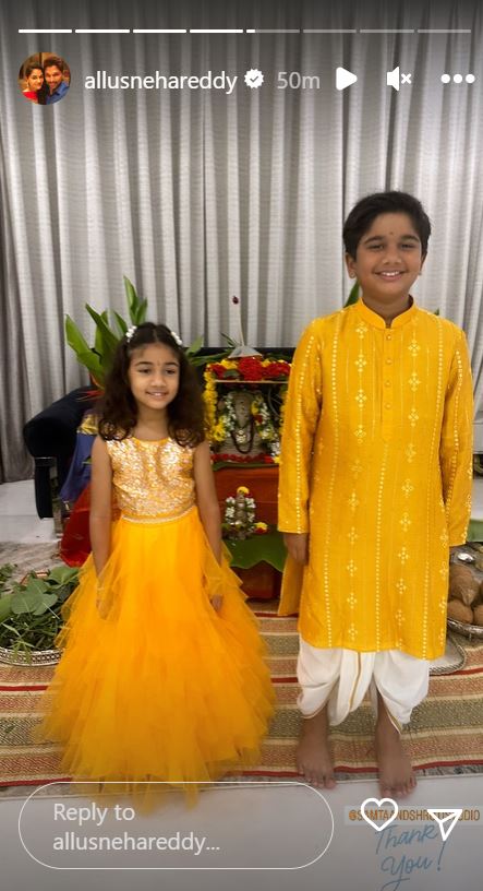 येलो रंग की फ्रॉक में आरहा एकदम प्रिंसेस लग रही हैं। अन्य फोटो में अल्लू आरहा गणेश जी के मंदिर के पास बैठी हुई हैं। वहीं, एक दूसरी फोटो में अल्लू अर्जुन और उनकी पत्नी कैमरा के लिए पोज देते हुए नजर आ रहे हैं।