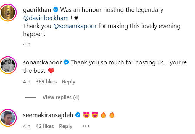 इस पोस्ट के बाद सोनम कपूर ने भी कमेंट करके अपनी प्रतिक्रिया दी। एक्ट्रेस ने लिखा 'हमें होस्ट करने के लिए बहुत-बहुत धन्यवाद, आप सर्वश्रेष्ठ हैं'। इसके साथ ही संजय कपूर, महीप कपूर, संगीता बिजलानी समेत कई सितारों ने इस पर कमेंट कर अपनी प्रतिक्रिया दी।