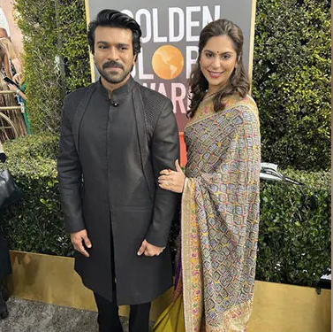 गोल्डन ग्लोब्स रेड कारपेट पर राम चरण ब्लैक शेरवानी सेट पहनकर एंट्री की। उन्होंने इस स्पेशल नाइट के लिए एक बंद गले का कुर्ता कैरी किया था। उनका ये कुर्ता फुल-लेंथ स्लीव्स, फ्रंट हिडन बटन क्लोजर, एक ब्रोच और साइड स्लिट्स थे। इसके साथ उन्होंने स्ट्रेट-फिट मैचिंग ब्लैक पैंट और मैचिंग शूज पहना था। अपने लुक को और भी खास बनाने के लिए राम चरण ने कान के स्टड के साथ साइड-पार्ट बैक-स्वेप्ट हेयर डू ने उनके रेड-कारपेट लुक को चार चांद लगा दिया था। राम चरण की पत्नी की उपासना कामिनेनी ने साड़ी में अवॉर्ड शो में अपना बिखेरा।