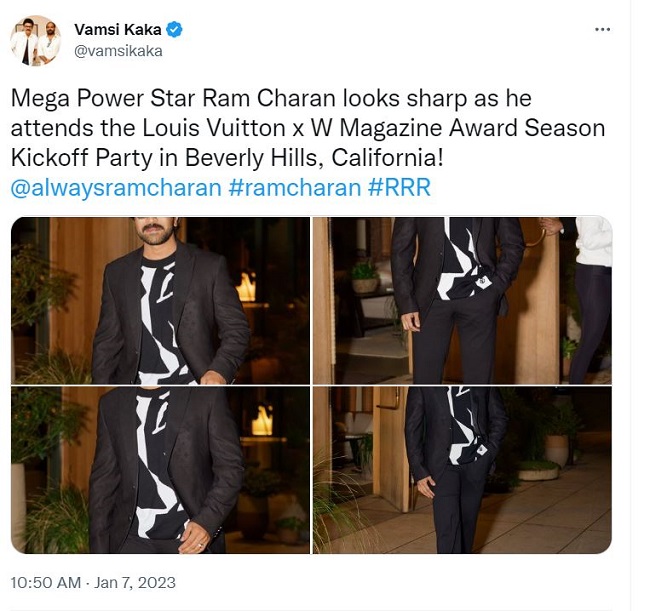 राम चरण के स्टाइल की भी लोग सराहना कर रहे हैं। राम चरण ने ब्लैक एंड वाइट ग्राफिक टी-शर्ट भी पहन रखा था। ट्विटर ने तस्वीरें शेयर करते हुए एक फैन ने लिखा है, 'राम चरण कितना अच्छा लग रहा है।'उन्होंने बेवर्ली हिल्स केलिफोर्निया में हुई पार्टी में भाग लिया है।' एक ने लिखा है, 'राम चरण बहुत अच्छा लग रहा है। उन्हें बहुत ही शानदार वेलकम मिला है।'