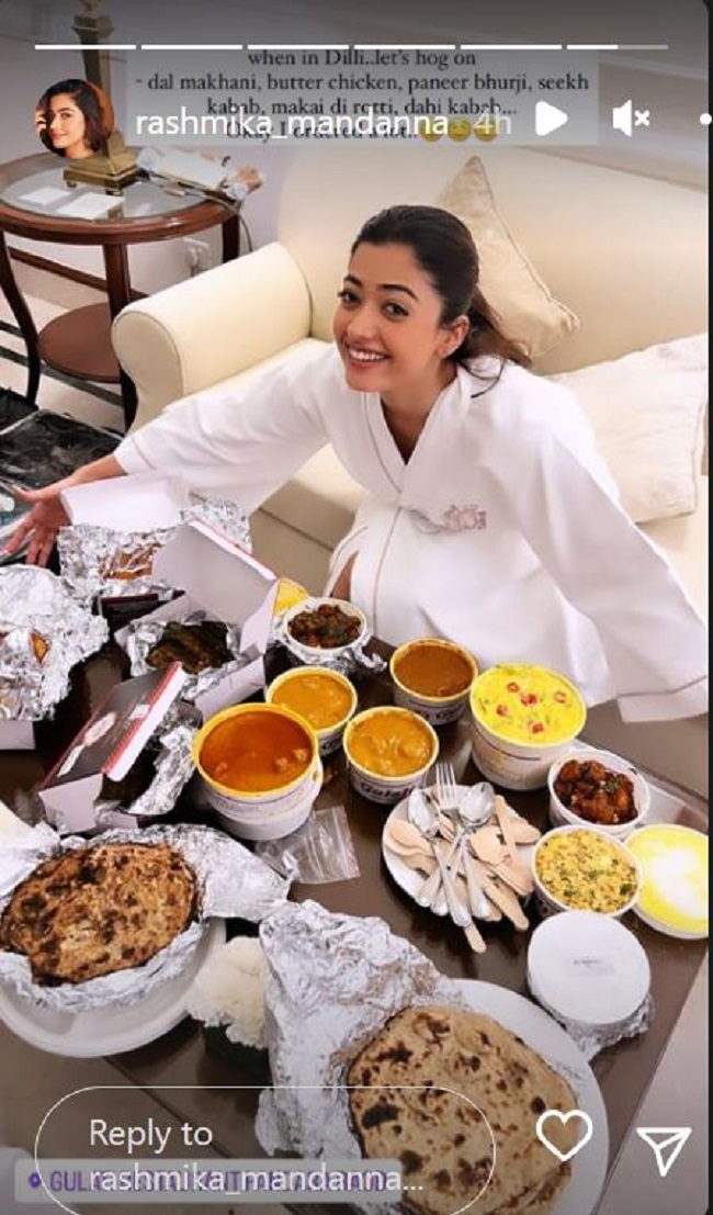 इसके पहले रश्मिका मंदाना ने इंस्टाग्राम पर एक तस्वीर शेयर की हैl इसमें उन्हें खाने की मेज पर बैठे हुए देखा जा सकता हैl वहीं इस अवसर पर उनकी टेबल पर दाल मखनी, बटर चिकन, पनीर भुर्जी, सीख कबाब, मकई की रोटी और दही कबाब रखा नजर आ रहा हैl रश्मिका मंदाना ने तस्वीरें शेयर करते हुए लिखा है, 'जब आप दिल्ली में होते हो तब आप इन सभी का सेवन करते होl' इसके अलावा उन्होंने अपनी एक हंसती हुई तस्वीर भी शेयर की हैl