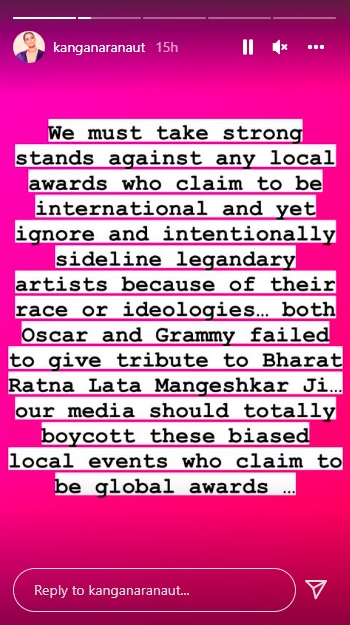 कंगना रनोट ने पोस्ट में लिखा, 'हमें किसी भी लोकल पुरस्कार के खिलाफ कड़ा रुख अपनाना चाहिए, जो अंतरराष्ट्रीय होने का दावा करता है और फिर भी दिग्गज कलाकारों को उनकी जाति या विचारधाराओं के कारण नजरअंदाज करता है। जानबूझकर दरकिनार करता है ... ऑस्कर और ग्रैमी दोनों भारत रत्न लता मंगेशकर जी को श्रद्धांजलि देने में विफल रहे ... हमारे मीडिया को वैश्विक पुरस्कार होने का दावा करने वाले इन पक्षपाती लोकल आयोजनों का पूरी तरह से बहिष्कार करना चाहिए।'