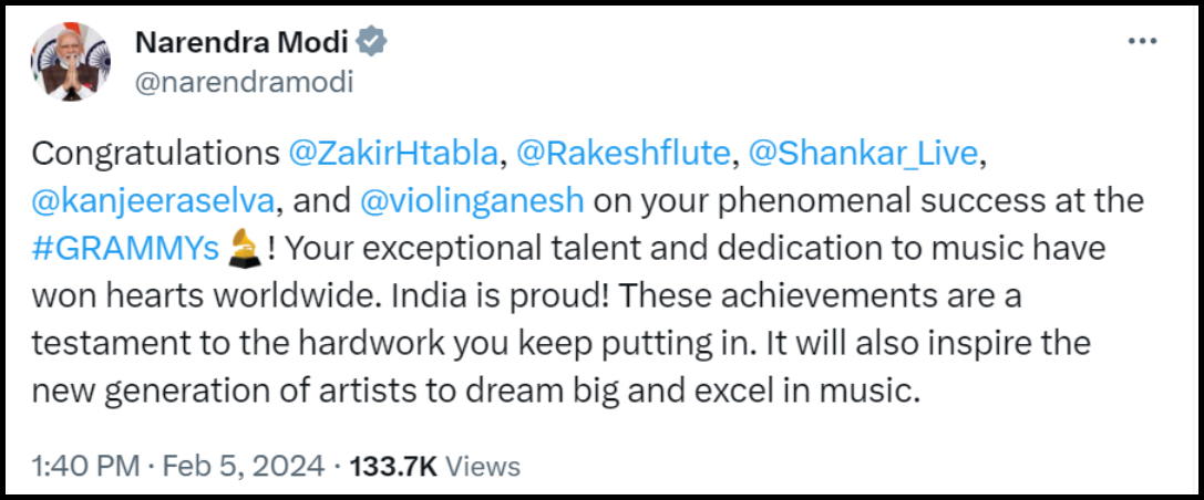 ''ग्रैमी में आपकी शानदार सफलता के लिए बधाई। संगीत के लिए आपके बेहिसाब हुनर और समर्पण ने दुनियाभर में लाखों दिलों को जीता है। भारत आज गर्व महसूस कर रहा है। यह पुरस्कार इस बात का सबूत हैं कि आप कितनी मेहनत करते हैं। यह उपलब्धि नयी पीढ़ी के कलाकारों को भी बड़े सपने देखने और संगीत के क्षेत्र में सर्वश्रेष्ठ देने के लिए प्रेरित करेगी।''