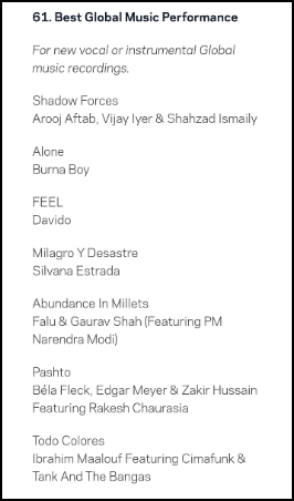 खास बात यह है कि इस बार पीएम मोदी का नाम भी ग्रैमी अवॉर्ड्स की नॉमिनेशन लिस्ट में नजर आया। एबन्डेंस इन मिलेट्स को बेस्ट ग्लोबल म्यूजिक परफॉर्मेंस कैटेगरी में नॉमिनेशन मिला था, जिसमें पीएम मोदी फीचर हुए हैं। इस गीत को फालू शाह और गौरव शाह ने तैयार किया था।