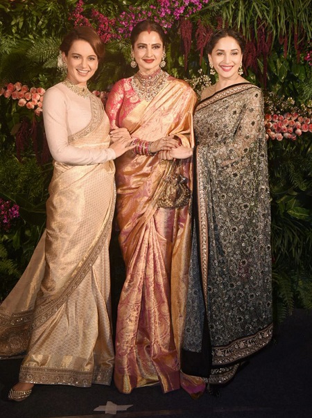 साथ ही नीचे की तस्वीर में आप कंगना रनौत, रेखा और माधुरी दीक्षित को देखें, इन अभिनेत्रियों ने भी इस ख़ास मौके के लिए अपना ड्रेस साड़ी ही रखा।