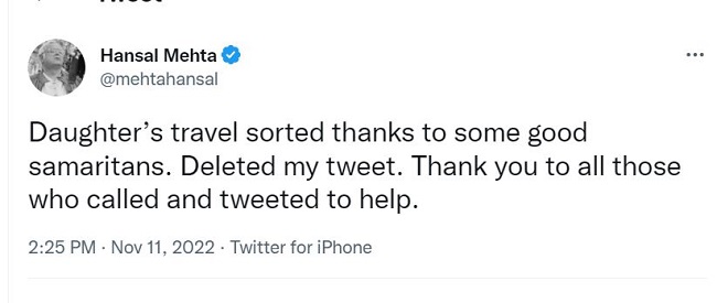 शुक्रवार को हंसल मेहता ने ट्वीट कर जानकारी दी कि उनकी बेटी बाली में थी और उसे भारत वापिस आने में परेशानियों का सामना करना पड़ सकता है। वह स्कूल ट्रिप पर गई थी। अब उन्होंने विदेश मंत्री से सहायता की गुहार लगाई है। इस बारे में हंसल मेहता लिखते है, 'मुझे तुरंत सहायता चाहिये। मेरी बेटी बाली में स्कूल ट्रिप पर गई थी, जहां वह अपना ओवरसीज सिटीजनशिप ऑफ इंडिया का कार्ड खो बैठी है। उसे कल भारत वापस आना है अन्यथा वह वहां फंस जाएगी। डॉ जयशंकर कृपया मदद करें।'