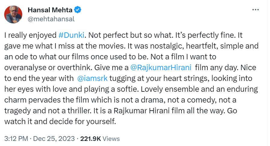 हंसल मेहता ने 'डंकी' का किया रिव्यू