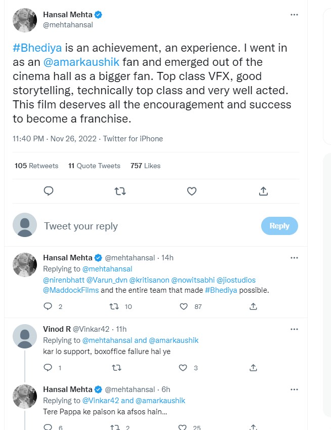 फिल्म निर्देशक और लेखक हंसल मेहता ने हाल ही में फिल्म भेड़िया की कहानी, वीएफएक्स और इसके लीड एक्टर्स वरुण धवन और कृति सेनन की तारीफ की। उन्होंने कुछ अच्छे शब्द कहे ही थे कि एक यूजर ने उन्हें रिप्लाई देते हुए 'भेड़िया' को बॉक्स ऑफिस फेलियर बता दिया। हंसल ने उस यूजर को आड़े हाथ लेते हुए बोलती बंद कर देने वाला जवाब दिया है।