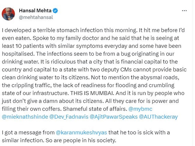 गुरुवार की सुबह हंसल मेहता ने एक ट्वीट किया है। इसमें उन्होंने पेट में संक्रमण होने की जानकारी दी है। उन्होंने यह भी कहा कि ऐसा मुंबई का पानी पीने के कारण हुआ है। उन्होंने आरोप लगाया कि महाराष्ट्र की सरकार स्वच्छ पानी पीने के लिए मुहैया कराने में नाकाम है। उन्होंने यह भी कहा कि डॉक्टर के पास प्रतिदिन इस प्रकार के कई मामले आ रहे हैं। हंसल मेहता ने ट्विटर पर लिखा है,