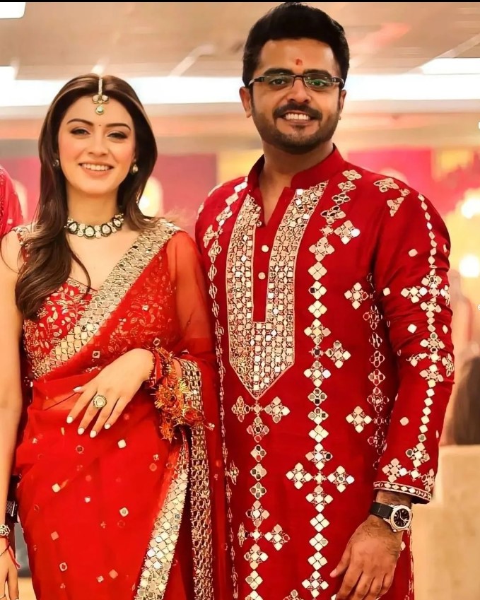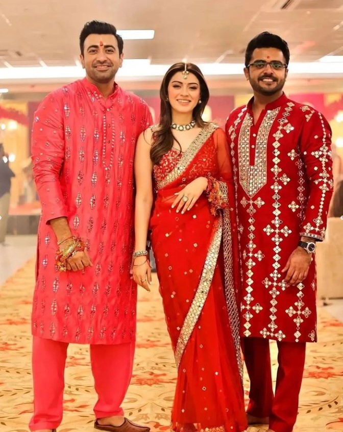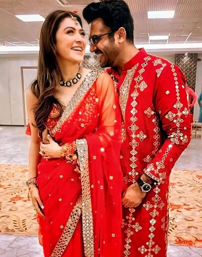सोशल मीडिया पर सामने आई हंसिका मोटवानी के इस प्री-वेडिंग सेलिब्रेशन की फोटो को उनके फैन पेज ने शेयर किया है। इनमें एक्ट्रेस रेड कलर की मिरर वर्क साड़ी में नजर आ रही हैं। एक्ट्रेस के साथ उनके होने वाले हसबैंड सोहेल कथुरिया भी पोज देते हुए दिखा रहे हैं। हंसिका के साथ ट्विनिंग करते हुए सोहेल ने भी मिरर वर्क वाला रेड कलर का कुर्ता पायजामा पहना। तस्वीरों में दोनों एक-दूसरे के बाहों में खोए हुए दिख रहे हैं। यहां देखें तस्वीरें...