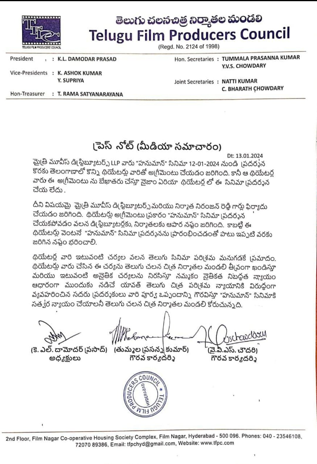 जिसमें बताया गया है- ''माइथ्री मूवीज डिस्ट्रीब्यूटर्स एलएलपी ने 12 जनवरी 2024 से तेलंगाना के सिनेमाघरों के मालिकों से फिल्म हनु मैन को प्रदर्शित करने के लिए एक समझौता किया। लेकिन उनमें से कुछ थिएटर्स ने इस समझौते का सम्मान नहीं किया है और मूवी की प्रदर्शित नहीं किया है, जिसको लेकर आपत्ति जताई गई है।