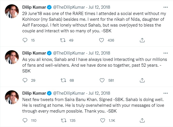 सायरा बानो ने लिखा था, 'कई वर्षों से हमारे साथ यह सिलसिला चलता आ रहा है। पिछले 29 जून को शायद जीवन में पहली बार ऐसा मौका आया जब मैं बिना अपने कोहिनूर (दिलीप कुमार) के किसी समारोह में गई। तन्हा महसूस कर रही थी। असिया फारुखी की बेटी निदा के निकाह में गई थी। बिना साहब के बहुत ही अकेलापन महसूस हो रहा था। लेकिन बहुत से लोगों से मिलने का मौका मिला। कृपया मेरे कोहिनूर की सेहत और खुशियों के लिए इसी तरह दुआएं करते रहिये।'
