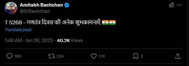 अमिताभ बच्चन भी ऐसे मौकों पर देश के सम्मान में आगे आने वाले कलाकारों में से एक हैं। अभिनेता ने भी एक्स पर एक पोस्ट शेयर किया है जिसमें उन्होंने लिखा, 'गणतंत्र दिवस की अनेक शुभकामनाएं।'