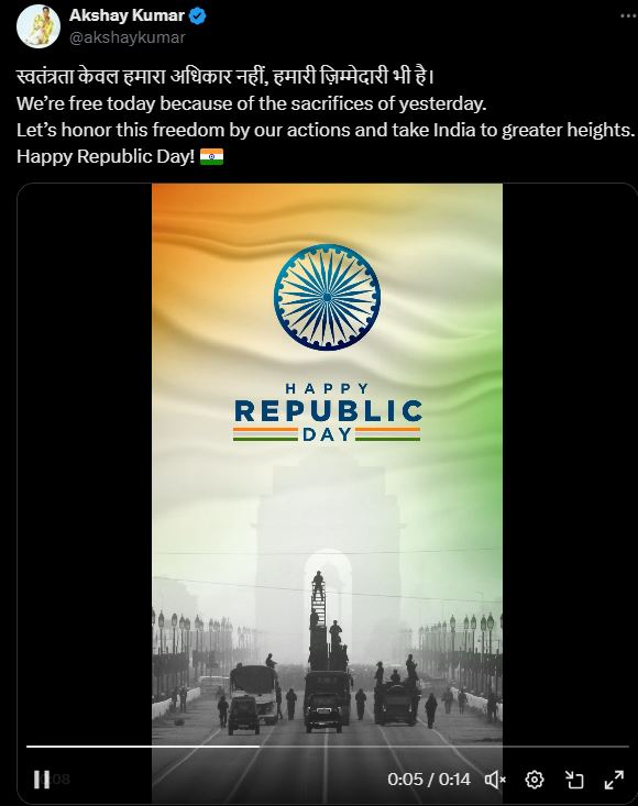 अक्षय कुमार ने अपने एक्स अकाउंट पर रिपब्लिक डे से जुड़ा एक मोशन पोस्टर शेयर किया है। पोस्टर के कैप्शन में उन्होंने लिखा, 'स्वतंत्रता सिर्फ हमारा अधिकार नहीं, हमारा जिम्मेदारी भी है। कल के बलिदानों की वजह हम आज स्वतंत्र हैं। आइए अपने कार्यों से इस स्वतंत्रता का सम्मान करें और भारत को नई ऊंचाइयों पर ले जाएं। गणतंत्र दिवस की शुभकामनाएं।'